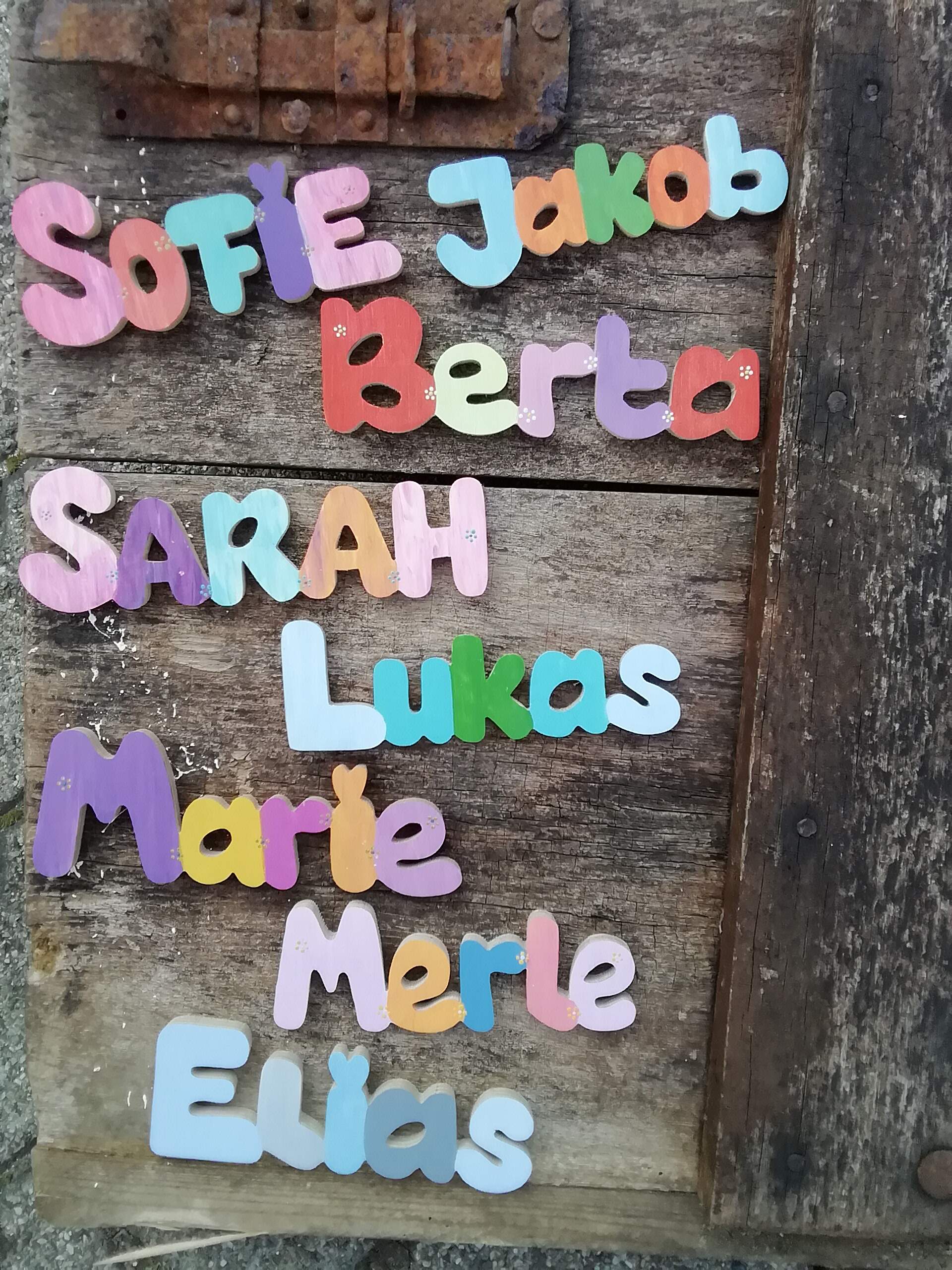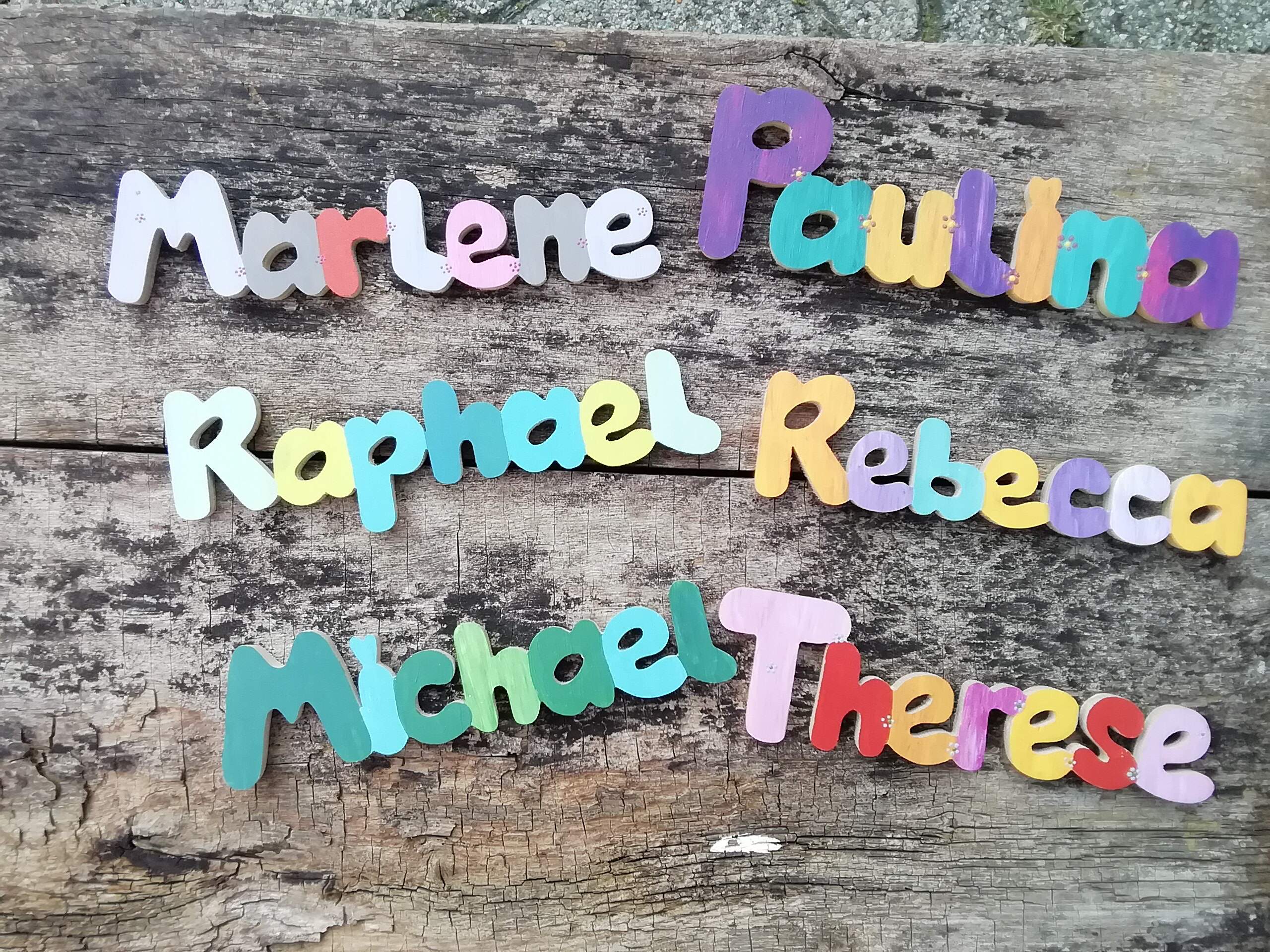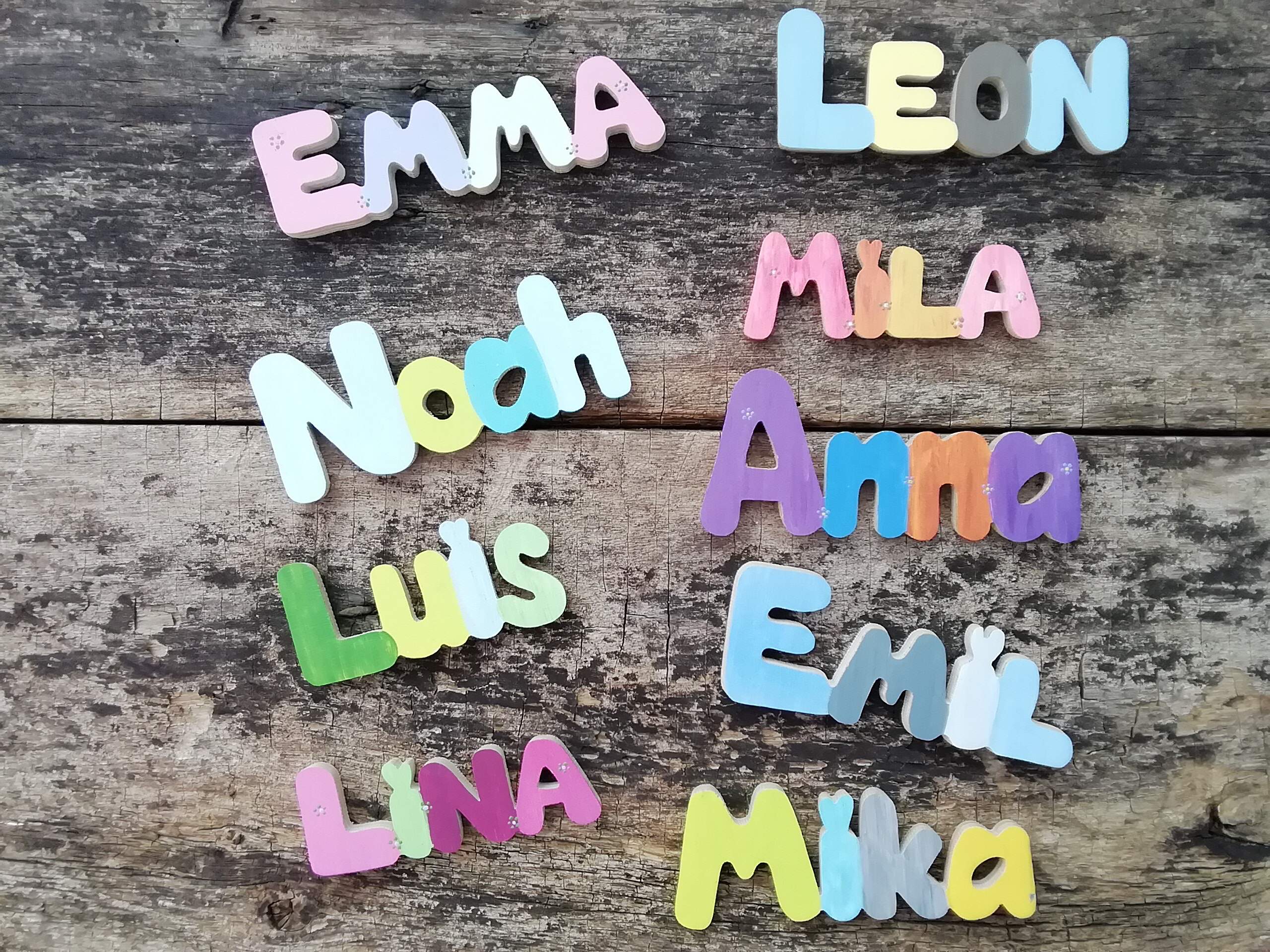 Oder lieber selbst gefertigte Holzbuchstaben für Namen? Die Buchstaben sind von Hand mit der Laubsäge ausgesägt, Schablonen werden nicht verwendet. Jeder Buchstabe ist absolut einmalig. Du suchst dir einfach eine Schrift aus, und jeder Name kann ausgesägt werden. Zum Abschluss kolorierten die Hersteller für dich die Buchstaben ganz nach deinen Wünschen mit fröhlichen, kindgerechten Naturfarben und fertig ist dein individuelles Präsent.