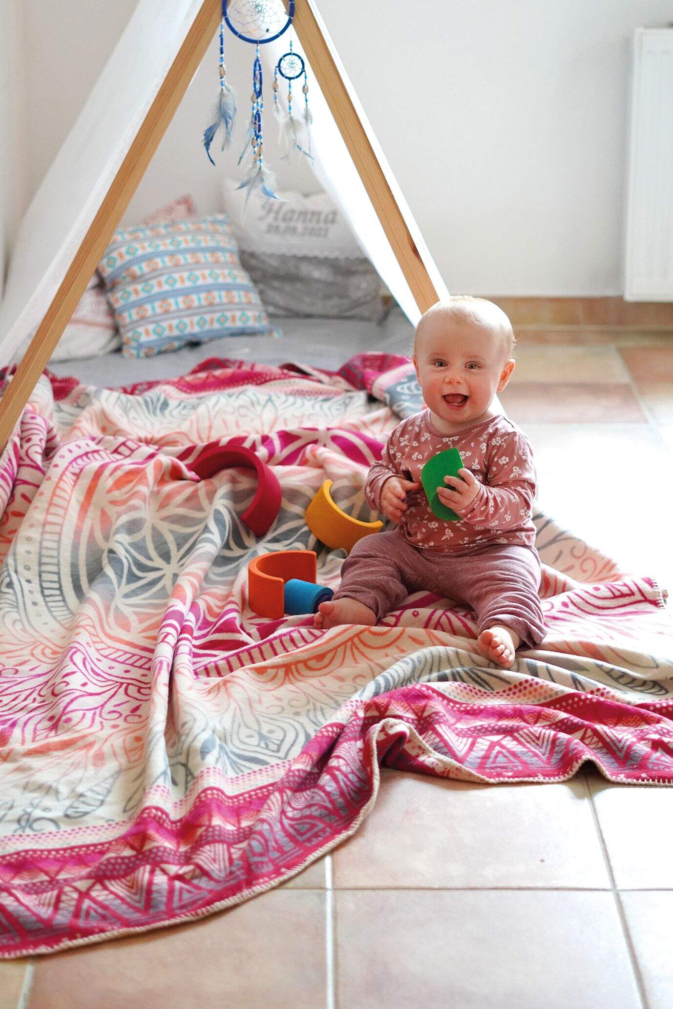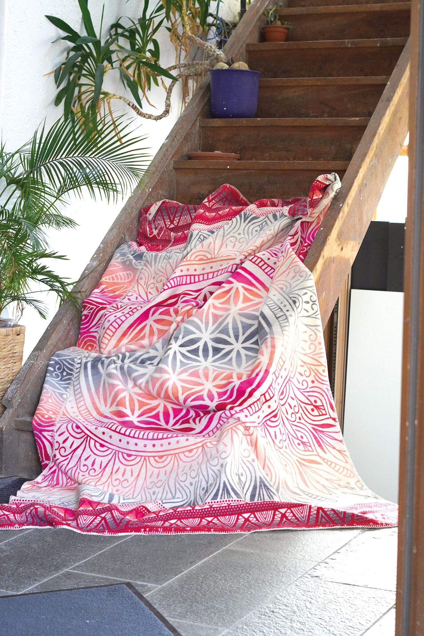 Kuscheldecke Blume des Lebens - rot / bunt - 100 % Biobaumwolle (kbA)